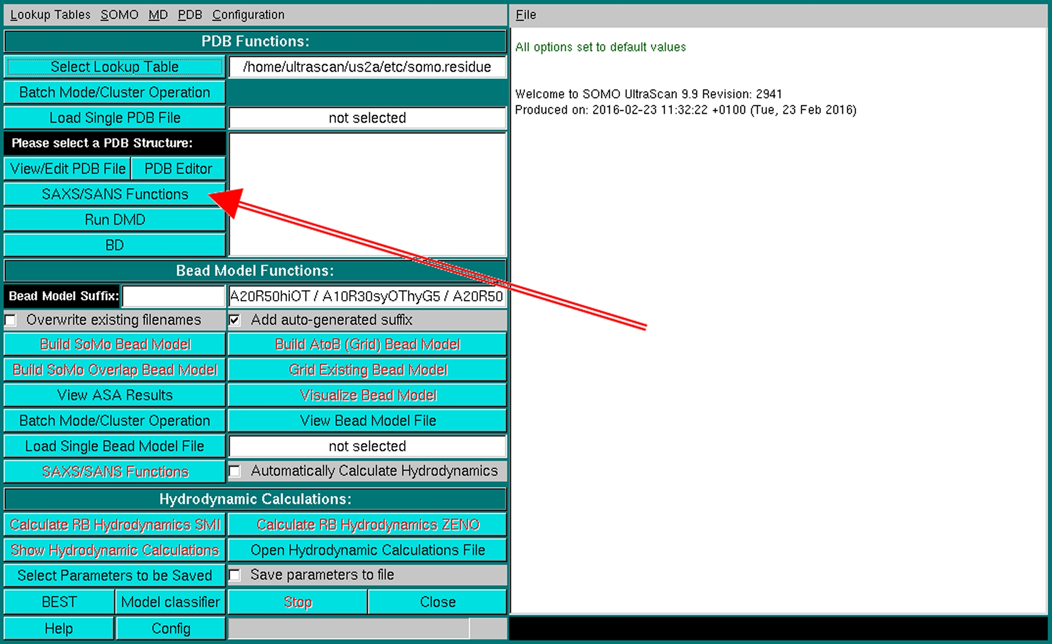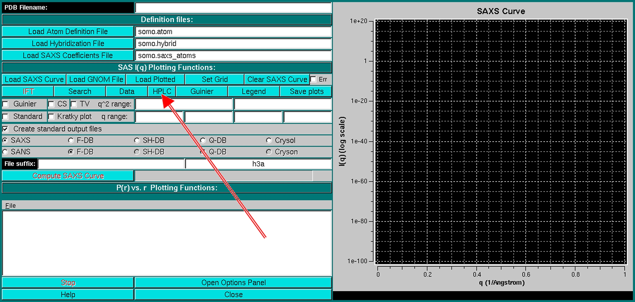- At this point, run the US-SOMO program by clicking the US-SOMO icon again, then click the "SAXS/SANS" button to open up the SAS module, then click the "HPLC" button to open up the HPLC module as shown here.